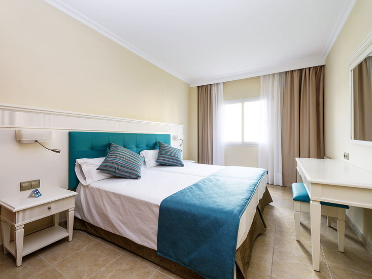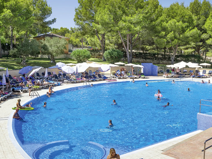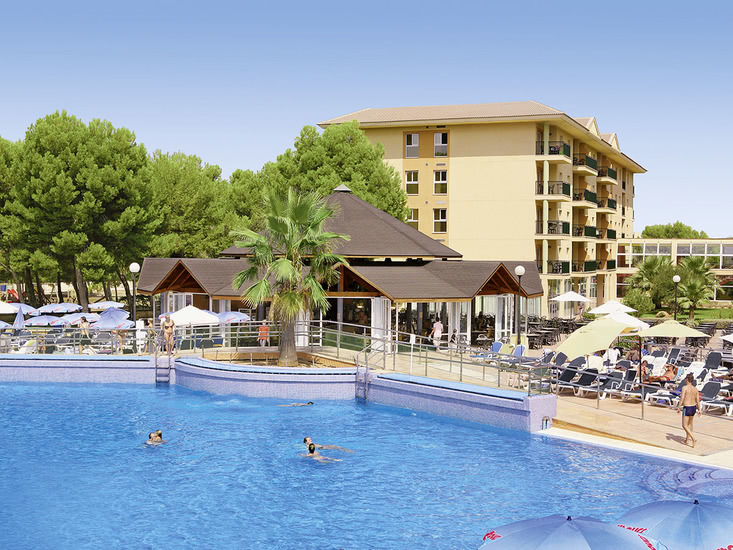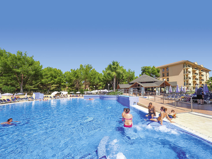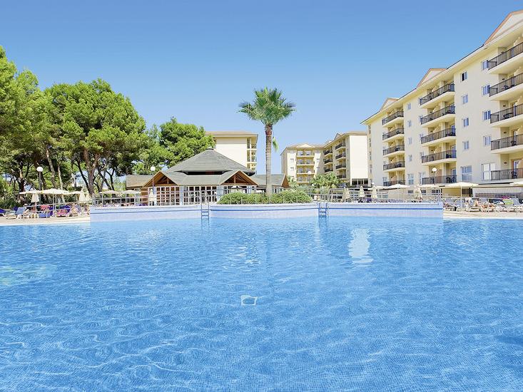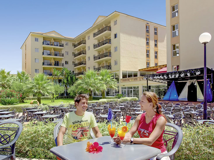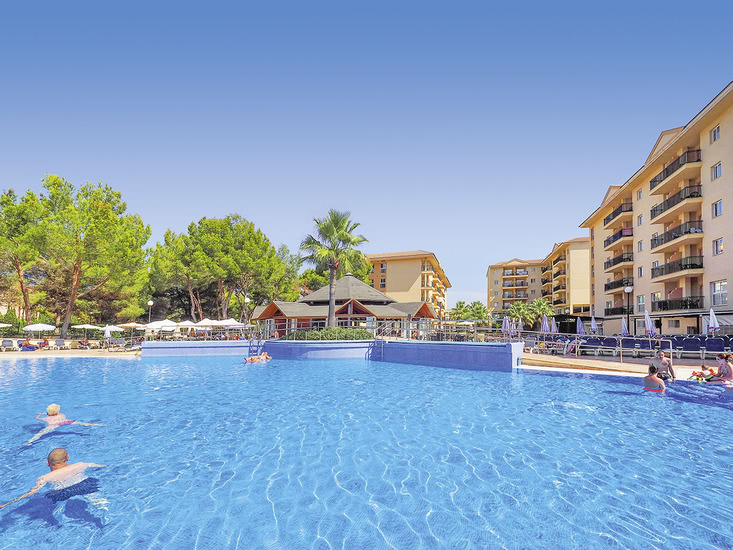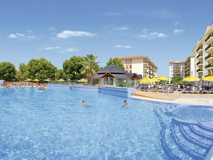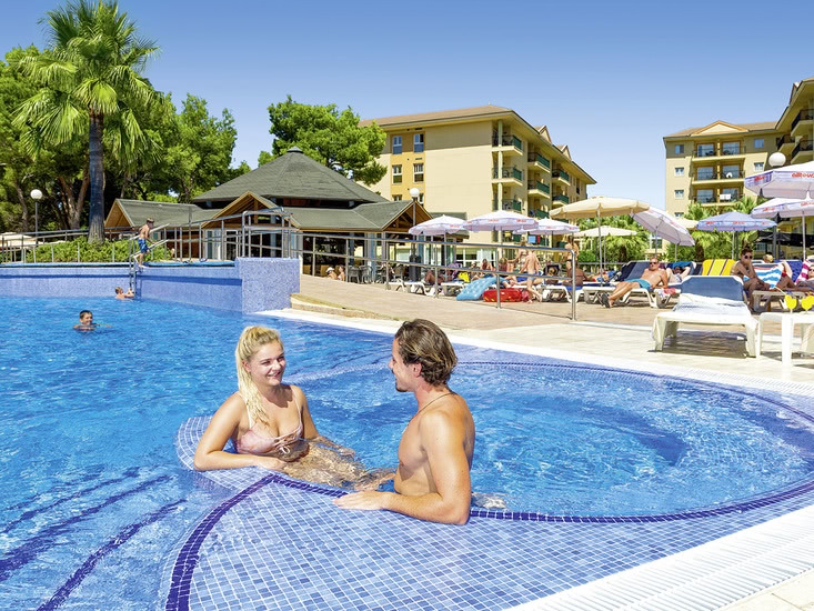 Komfortabel ausgestattete Ferienanlage, Haupthaus und 2 Wohngebäude, großzügiger Garten mit Poollandschaft, mehrere Sonnenterrassen, Liegen und Schirme, Poolbar mit Sitzterrasse, Showbühne. Im Haupthaus Empfangshalle, Rezeption, WLAN (geg. Geb.), Sitzgruppen, Aufenthaltsraum (TV), Supermarkt, Bar, Restaurant. Landeskat.: 4 Sterne, 185 Einheiten, 4 Etagen, 2 Lifte pro Gebäude.