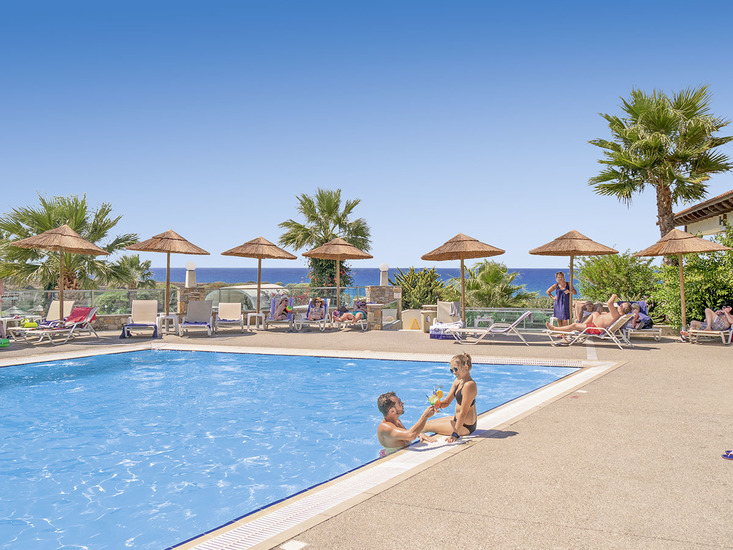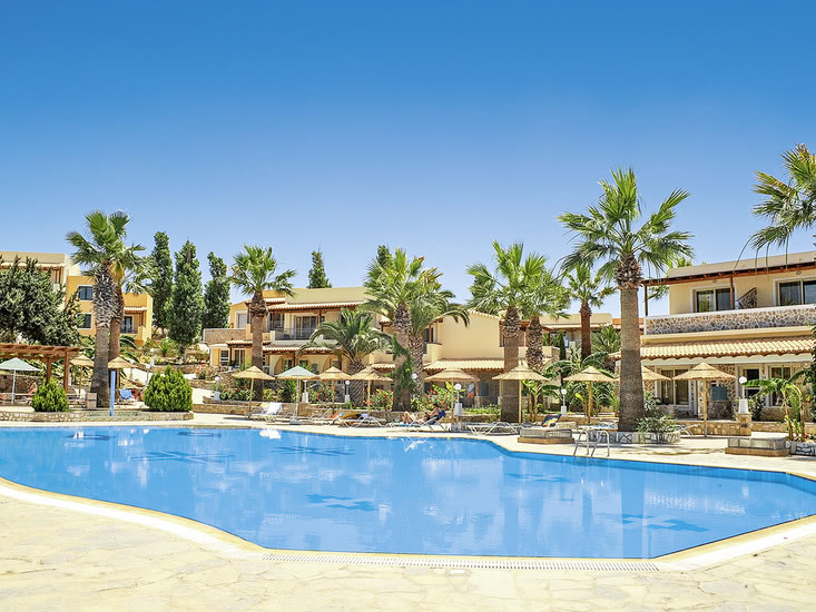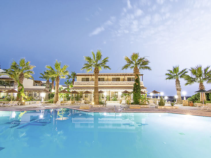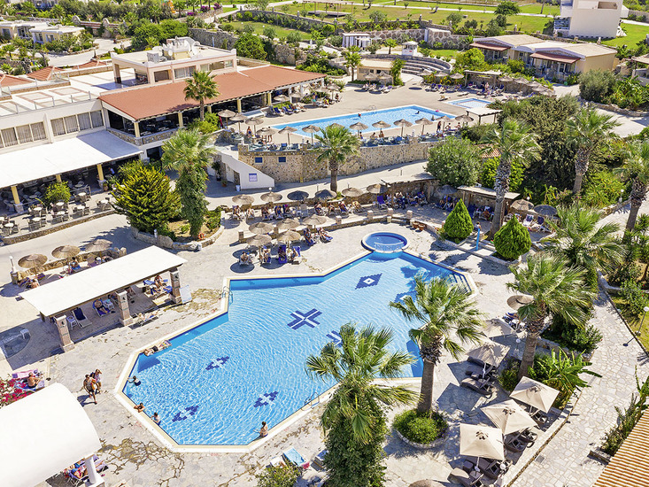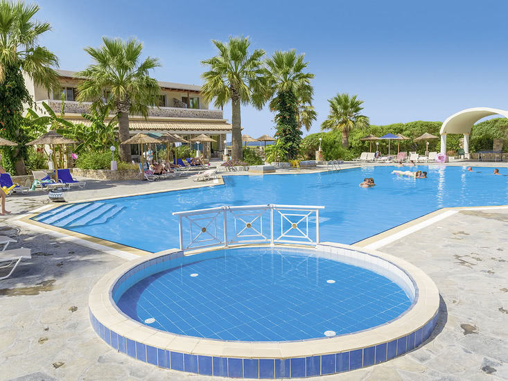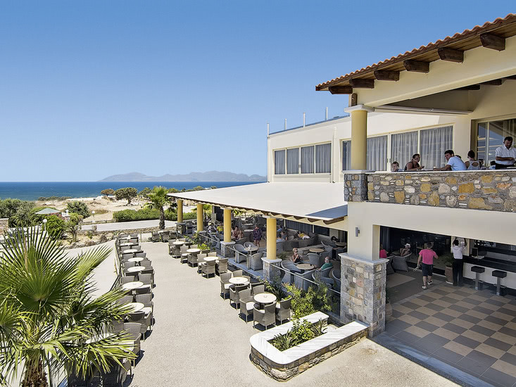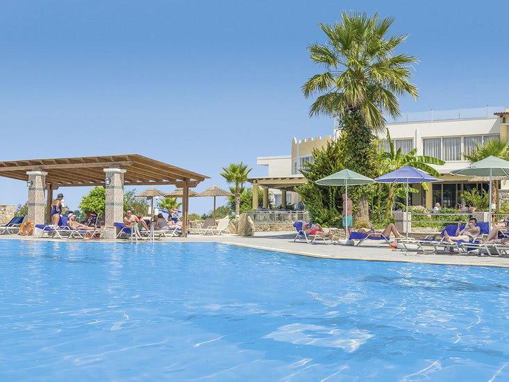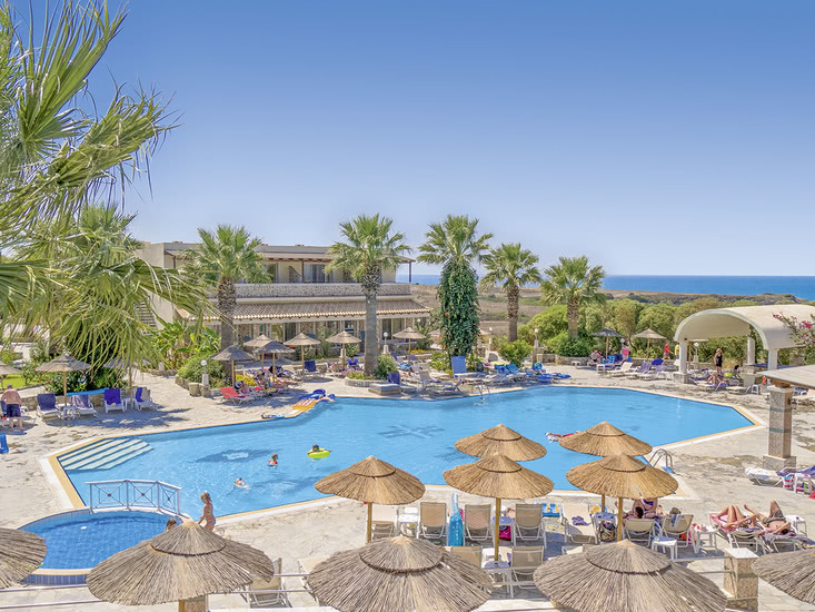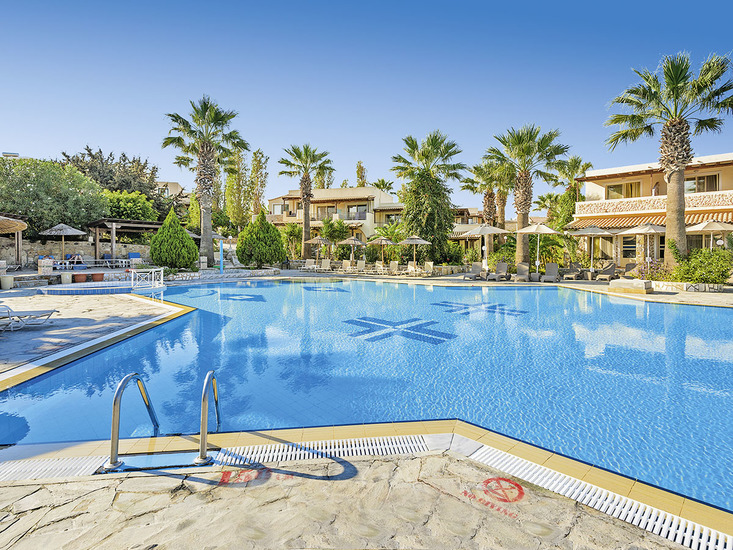 Komforthotel im Bungalowstil mit Haupthaus und mehreren Wohngebäuden, 2 Swimmingpools, umgeben von Sonnenterrassen mit Liegen und Schirmen (am Pool und am Strand inklusive). Pool-/Snackbar mit teilweise überdachter Sitzterrasse und tollem Blick auf das Meer. Empfangshalle mit Rezeption, WLAN, Restaurant, Bar, Dachterrasse mit Cocktailbar. Taverne/ Beachbar mit schöner Sitzterrasse, abends À-la-carte-Restaurant (Reservierung erforderlich, 1x pro Aufenthalt inklusive, Getränke gegen Gebühr). Minimarkt. Landeskategorie: 5 Sterne, 216 Einheiten, 1-2 Etagen.