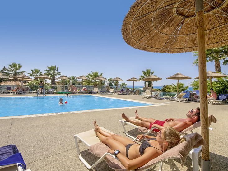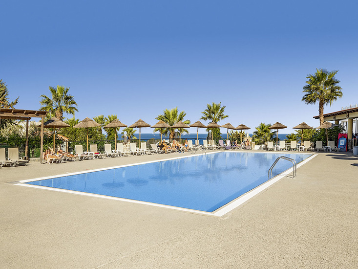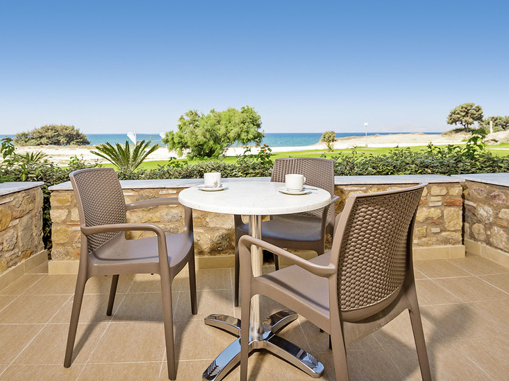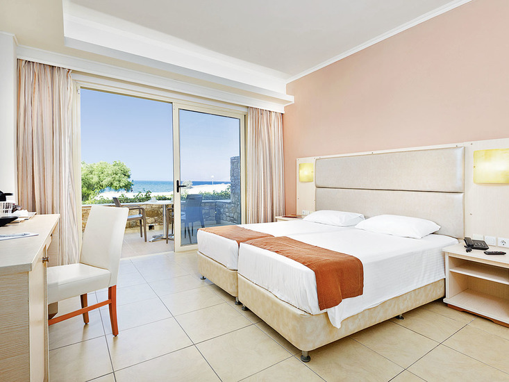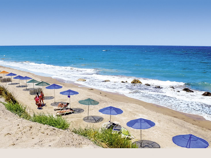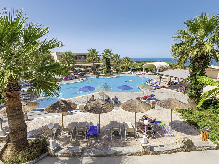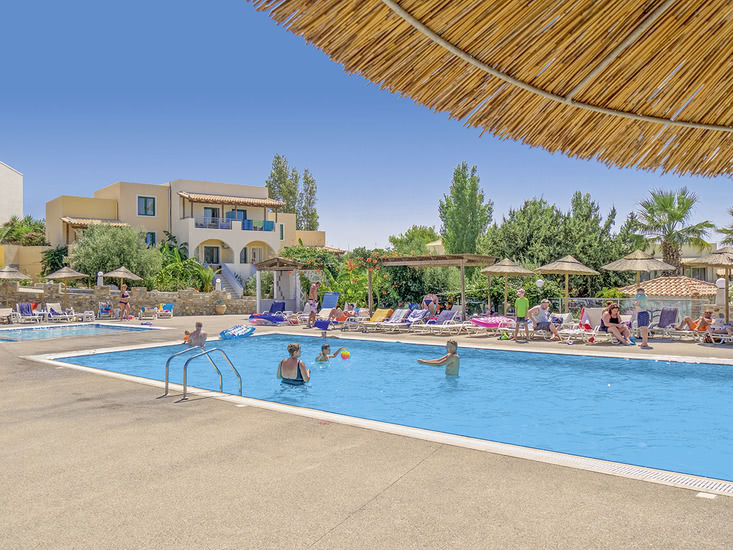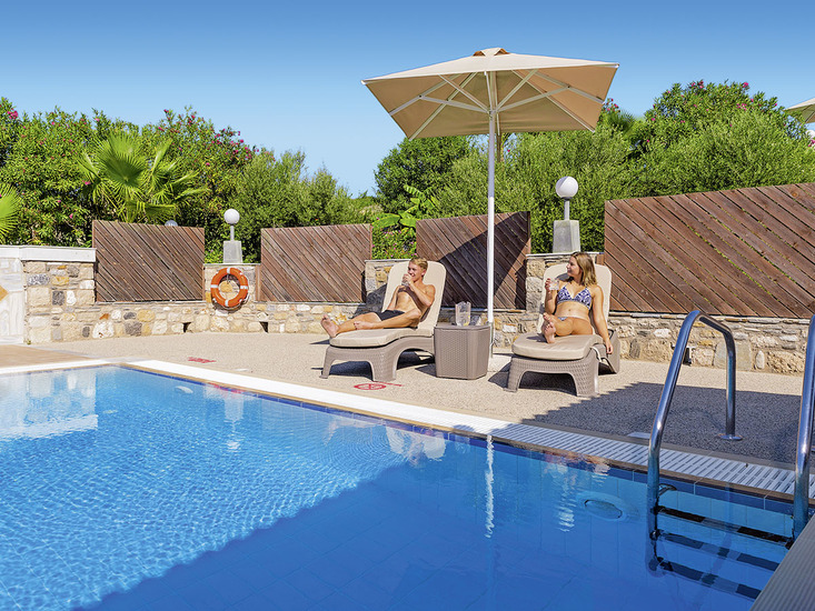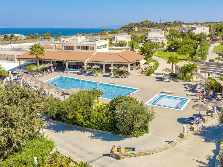 Komforthotel im Bungalowstil mit Haupthaus und mehreren Wohngebäuden, 2 Swimmingpools, umgeben von Sonnenterrassen mit Liegen und Schirmen (am Pool und am Strand inklusive). Pool-/Snackbar mit teilweise überdachter Sitzterrasse und tollem Blick auf das Meer. Empfangshalle mit Rezeption, WLAN, Restaurant, Bar, Dachterrasse mit Cocktailbar. Taverne/ Beachbar mit schöner Sitzterrasse, abends À-la-carte-Restaurant (Reservierung erforderlich, 1x pro Aufenthalt inklusive, Getränke gegen Gebühr). Minimarkt. Landeskategorie: 5 Sterne, 216 Einheiten, 1-2 Etagen.