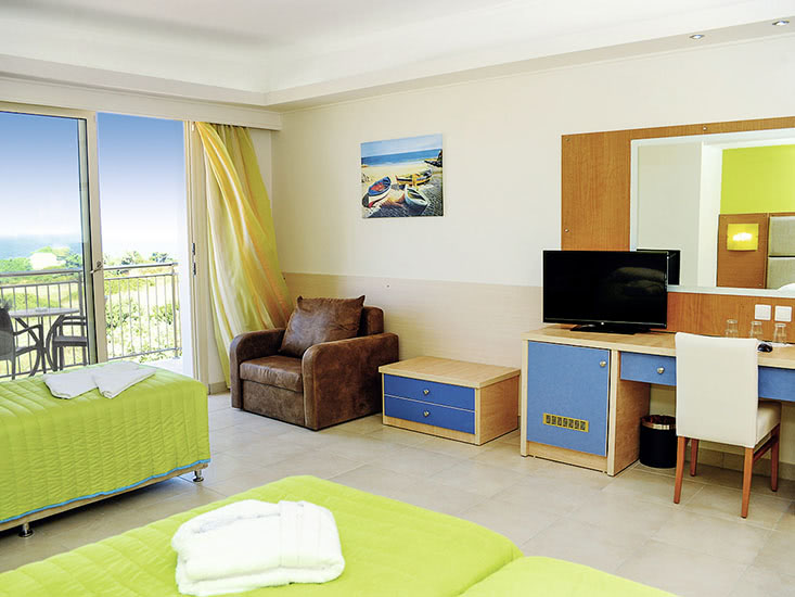 • Familienzimmer (FZ, ca. 35 qm), modern eingerichtet, Wohn-/Schlafbereich und sep. Schlafzimmer, Klimaanlage, Kühlschrank, Kaffee-/Teezubereiter, TV, Safe. Bad, WC, Föhn, Bademäntel und Slipper. Balkon/Terrasse. Max. 4E