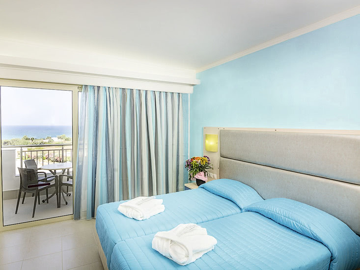 • Deluxe-Doppelzimmer (DZD, ca. 29 qm), elegant gestaltet, Klimaanlage, Kühlschrank, Kaffee-/Teezubereiter, Nespresso-Maschine®, TV, Safe. Bad, WC, Föhn, Bademäntel und Slipper. Balkon/Terrasse mit Meerblick. Max. 3E