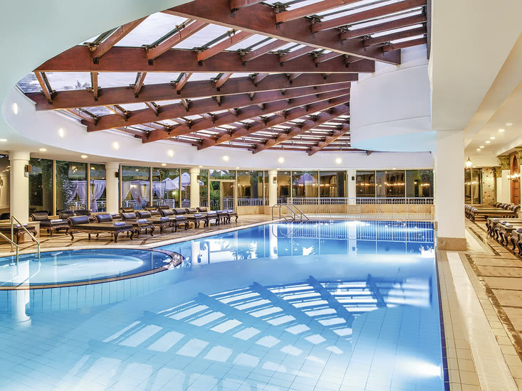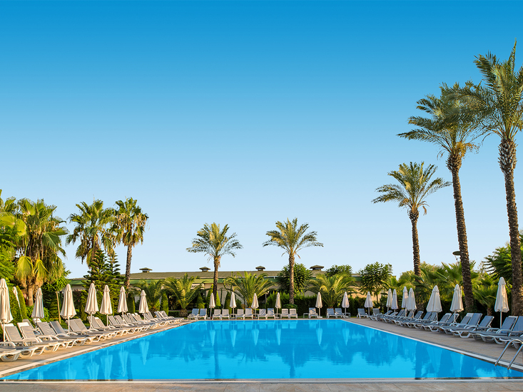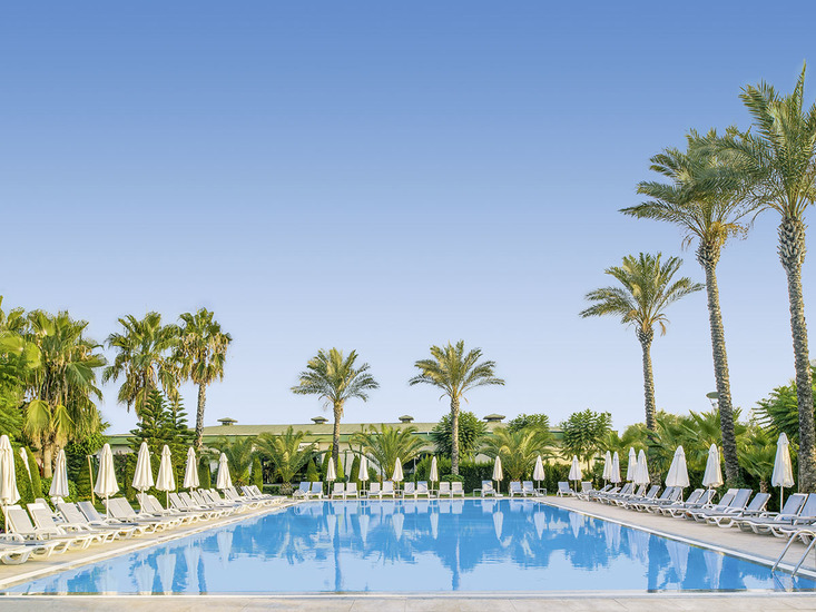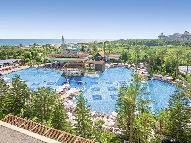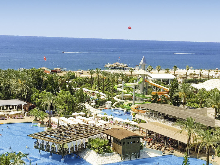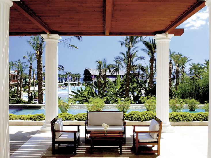 Stilvolles Luxushotel mit Gartenanlage, Sonnenterrassen und Swimmingpoollandschaft, Relaxpool, Aquapark. Liegen, Schirme, Auflagen, Badetücher. Wasserrutschen, Pool-/ Snackbars, Amphitheater. Empfangshalle, Rezeption (WLAN), Lobbybar. Spielezimmer, Internetcafé (jew. gegen Gebühr). Restaurant, 7 À-la-carte-Restaurants, Patisserie. Kino, Geschäfte. Landeskategorie: 5 Sterne, 481 Zimmer, 6 Etagen, 5 Lifte.