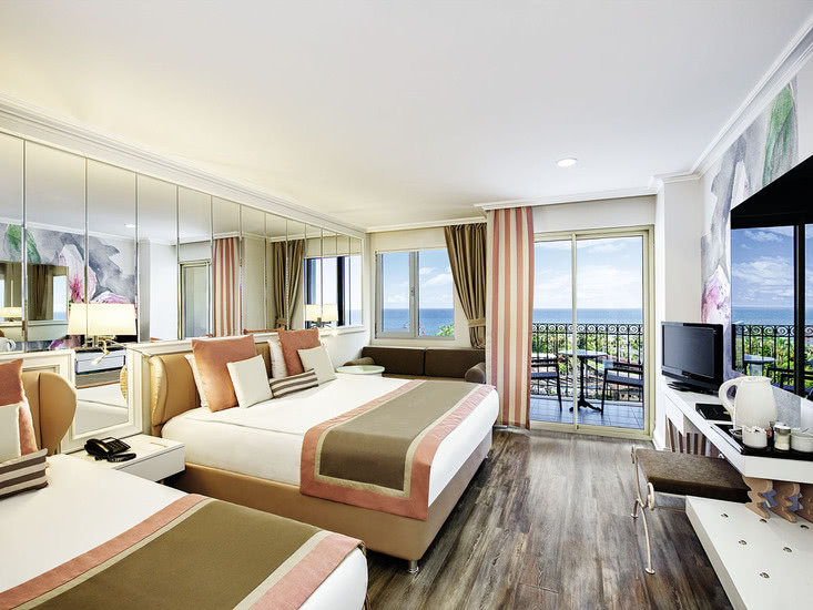 • Familienzimmer (FZM, ca. 47 qm), separates Schlafzimmer/Maisonettestil (nach Verfügbarkeit), Klimaanlage (zentral, stdw.), Minibar, Telefon, TV, Safe. 2x Dusche, WC, Föhn. Balkon, Landseite oder seitlicher Meerblick (nach Verfügbarkeit). Max. 4E+1K