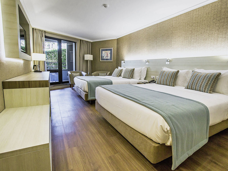 • Familienzimmer (ca. 33 qm), renoviert, Klimaanlage, TV (32 Zoll), Minibar (1x täglich Auffüllung der Softdrinks), Telefon, WLAN, Safe. 2 Kingsizebetten. Bad/Dusche, WC, Föhn. Balkon, seitlicher Meerblick. Max. 4E
