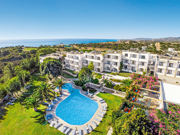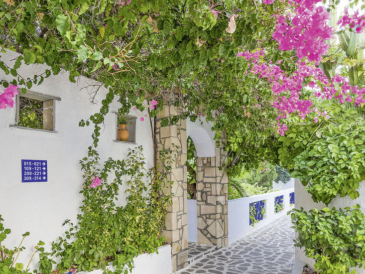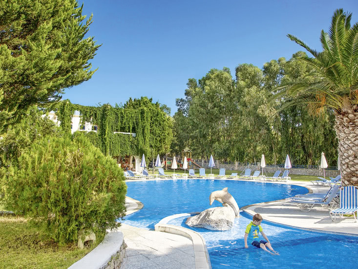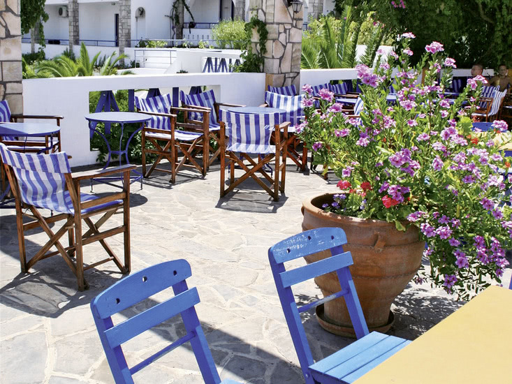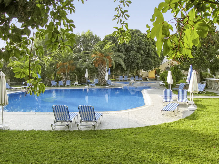 Im griechischen Stil erbaute Ferienanlage, die von der deutschsprachigen Besitzerfamilie sehr persönlich geführt wird. Eine wunderbare, freundliche, familiäre Atmosphäre macht das Hotel zu einem tollen Ort für Familien. Die Anlage besteht aus einem Haupthaus und verschiedenen Wohngebäuden und bietet in der schönen Gartenanlage einen Swimmingpool mit integriertem Kinderbecken. Sonnenterrasse, Liegen und Schirme (am Pool inklusive, am Strand gegen Gebühr), Pool-/Snackbar mit Sitzterrasse und Spielplatz. Ruhegarten mit Chill-out-Zone und kleinem Teich. Empfangshalle mit Rezeption und WLAN (in der Lobby). Bar, TV-Ecke (Großbildschirm), Restaurant mit schön begrünter Terrasse und Minimarkt. Landeskategorie: 3 Sterne, 67 Einheiten. 2-3 Etagen. Fahrstuhl vorhanden