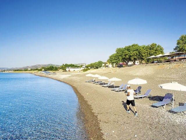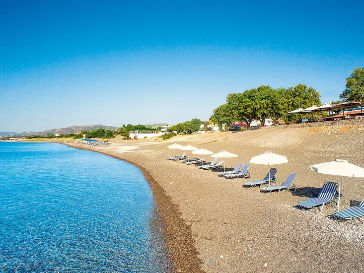 Vom schönen, langen Strand (Sandstrand, mit groben Kieseln durchsetzt), den Sie über einen Weg durch die hoteleigene Gartenanlage erreichen, ca. 300 m entfernt im Feriengebiet Kiotari. Mehrere Einkaufsmöglichkeiten in ca. 100 m, Tavernen am Strand in ca. 300 m und Unterhaltungsmöglichkeiten in ca. 1,5 km Entfernung. Die kleinen Ortschaften Gennadi und Asklepios sind ca. 4 km entfernt. Lindos liegt in ca. 15 km Entfernung. Regelmäßige Linienbusverbindung, Haltestelle in ca. 50 m.