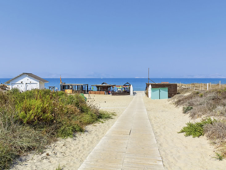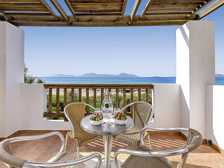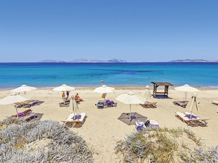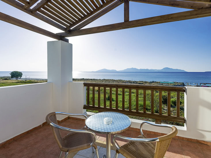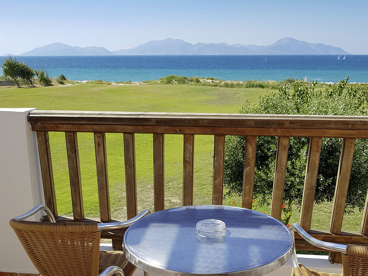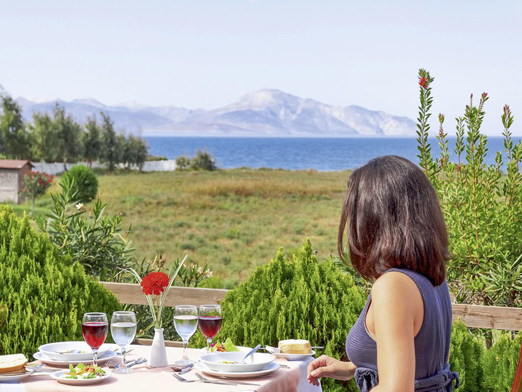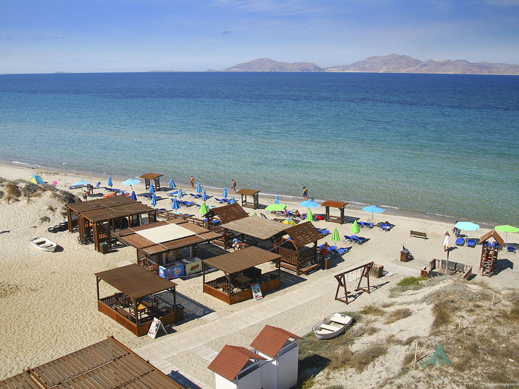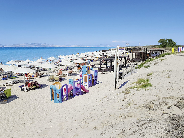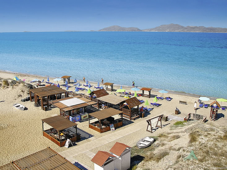 Direkt am langen, flach abfallenden, feinen Sandstrand, der zu den schönsten der Insel gehört. Restaurant und Bars in der Nähe, bis Mastichari ca. 6 km.