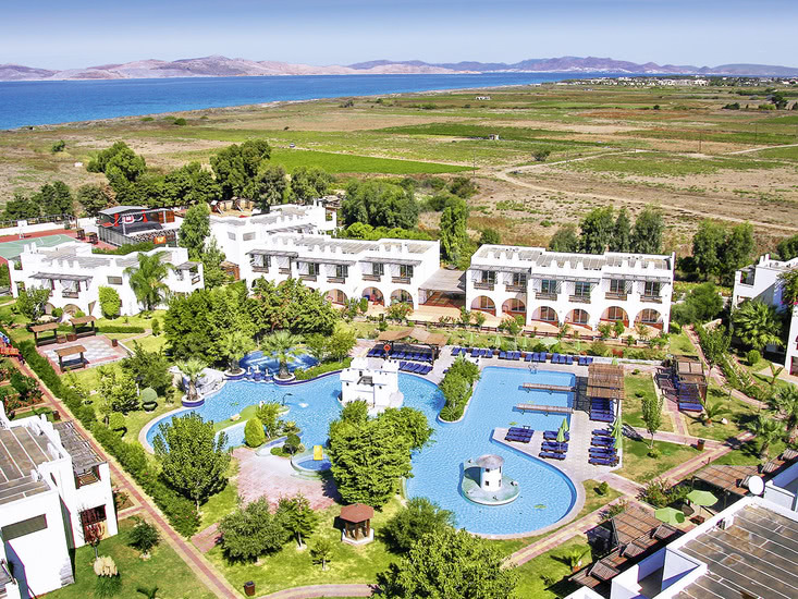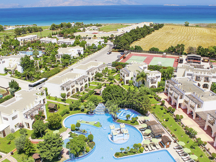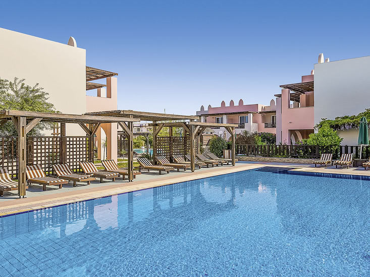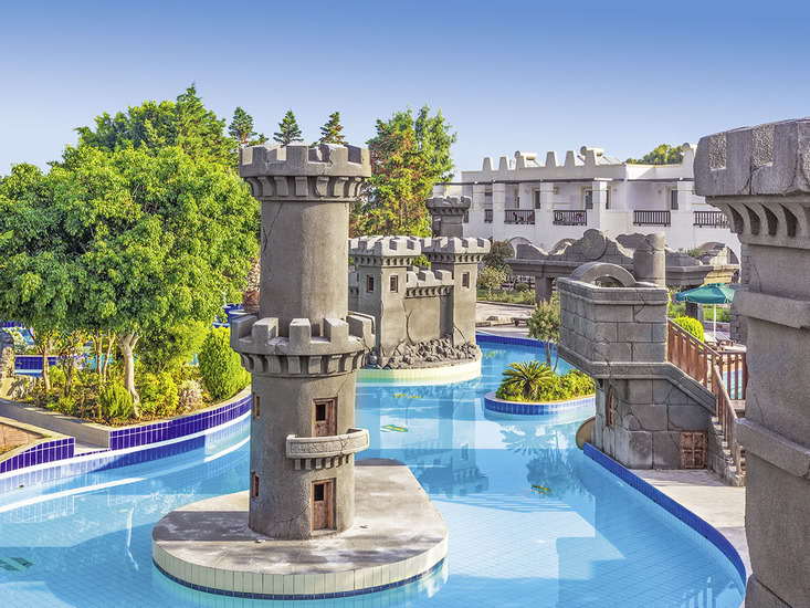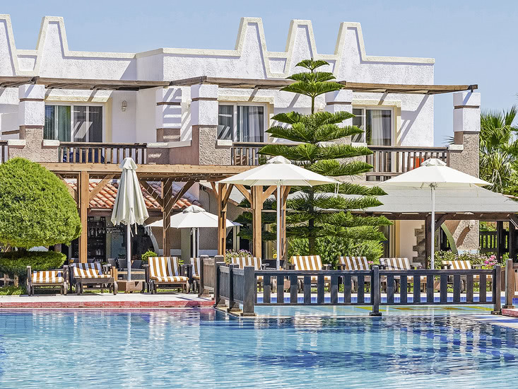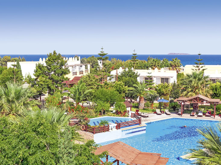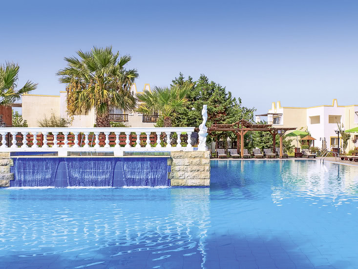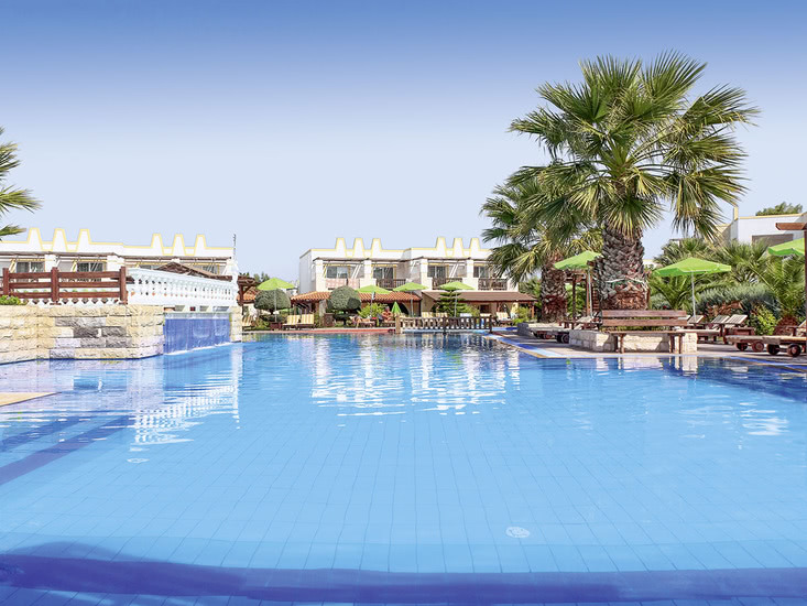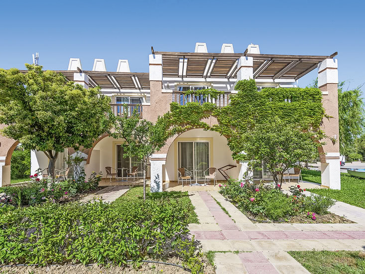 Weitläufige Hotelanlage (ca. 70.000 qm) im Villagestil mit liebevoll angelegtem Garten. Mehrere Wohngebäude gruppieren sich jeweils um die 3 Swimmingpools. Sonnenterrassen mit Liegen und Schirmen (am Pool inklusive, am Strand gegen Gebühr), Pool-/Snackbar mit teilweise überdachter Sitzterrasse. Empfangshalle mit Rezeption, Mietsafe, WLAN, Restaurant, Bars, Minimarkt. Streichelzoo, Amphitheater. Landeskategorie: 4 Sterne, 311 Zimmer, 3 Etagen.