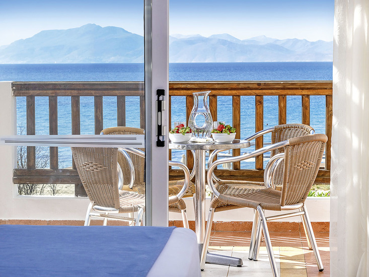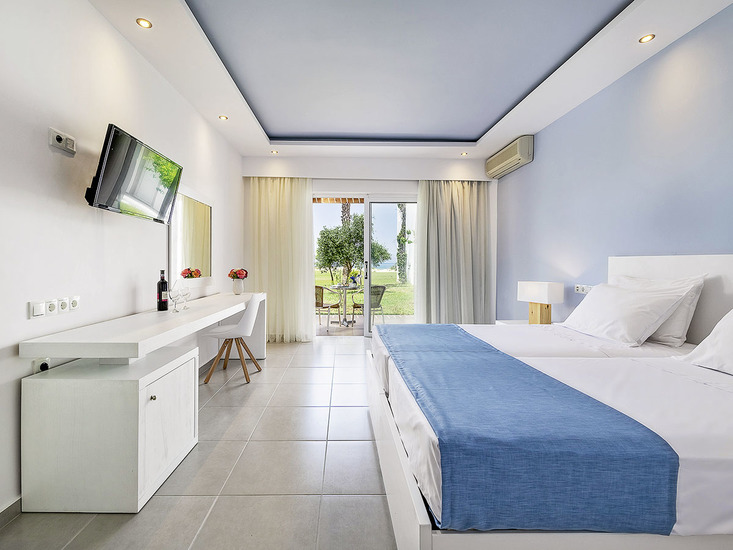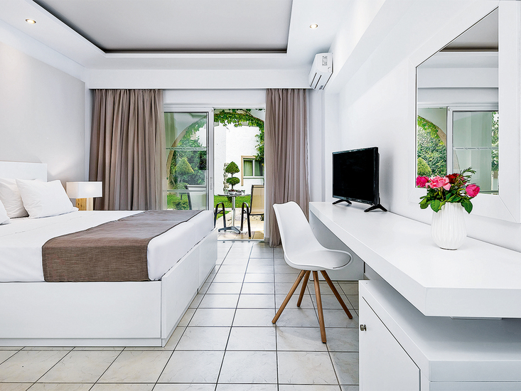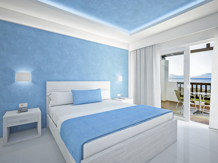 • Doppelzimmer-Superior (DSP, ca. 25 qm), komplett renoviert, Klimaanlage, Kühlschrank, TV. Mietsafe. Bad oder begehbare Dusche, WC, Föhn. Balkon oder Terrasse, wahlweise mit seitlichem Meerblick (DSM). Max. 3E
