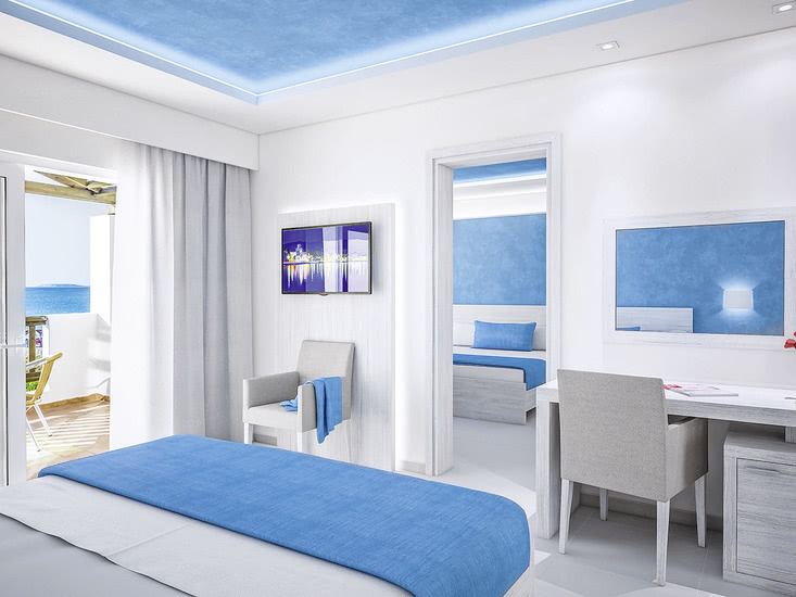 • Familienzimmer-Superior (FSP, ca. 40 qm), komplett renoviert, 2 separate Schlafzimmer, 2 Klimaanlagen, Kühlschrank, 2 TV. Mietsafe. Bad oder begehbare Dusche, WC, Föhn. Balkon, wahlweise mit seitlichem Meerblick (FSM). Max. 5E