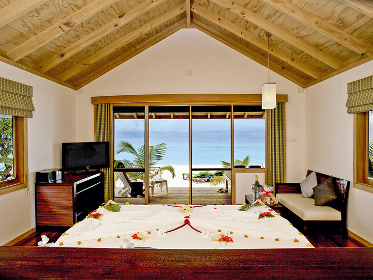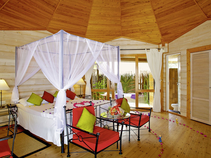 • Sangu-Wasservillen (VIW, ca. 70 qm, 4,5 St.), auf Stelzen errichtet, Klimaanlage, Minibar, Kaffee-/Teezubereiter, WLAN (500 MB pro Tag/pro Person inkl.), Telefon, TV, Safe. Dusche, WC, Föhn, privates, möbliertes Sonnendeck, direkter Zugang zum Meer. Max. 3E (buchbar ab 18 Jahren)