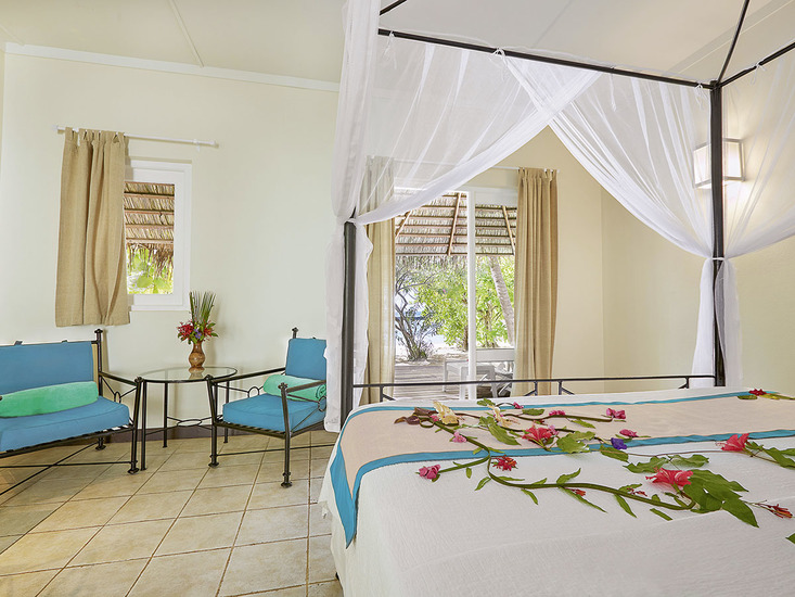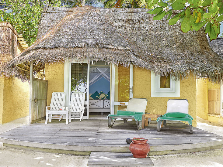 • Gardenbungalows (BU, ca. 54 qm, 4 St.), Klimaanlage, Minibar, Kaffee-/Teezubereiter, WLAN (500 MB pro Tag/pro Person inkl.), Telefon, Safe. Dusche, Bluetooth-Soundbar, WC, Föhn, Terrasse, wahlweise als Beachbungalow (BUB) direkt am Strand. Max. 3E/2E+1K