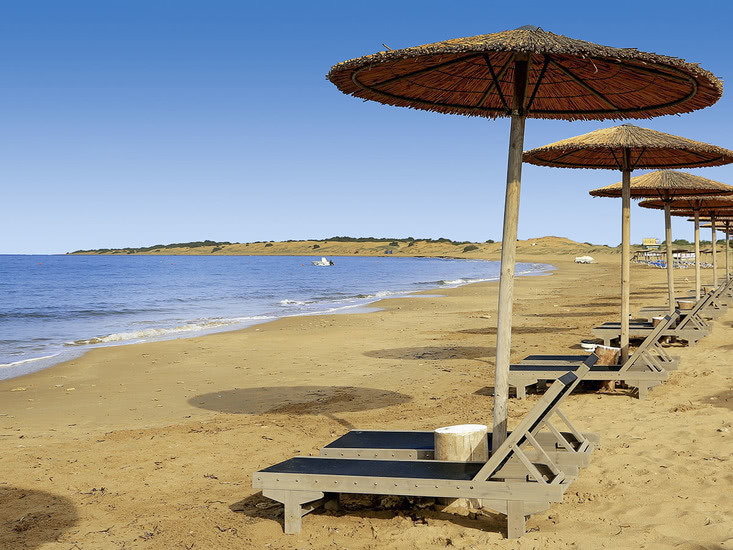 Direkt am flach abfallenden, feinsandigen Strand von Agios Georgios. Der ehemalige Fischerort ist ca. 200 m entfernt.