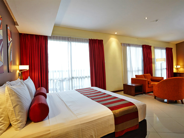 • Deluxe-Zimmer (DZD, ca. 35 qm) Klimaanlage, Minibar, Safe, Telefon, WLAN, Dusche, WC, Föhn, Balkon mit Meerblick. Max. 3E
